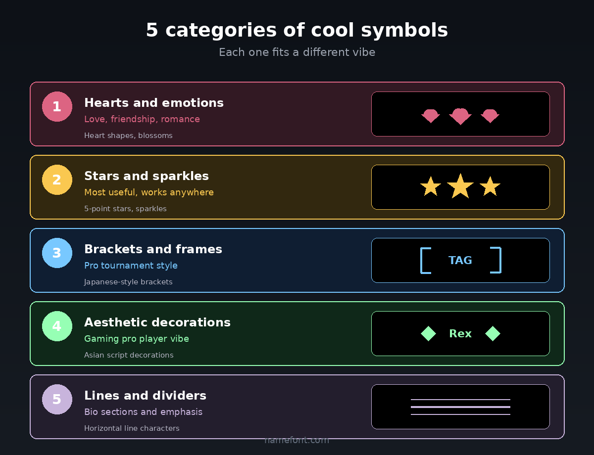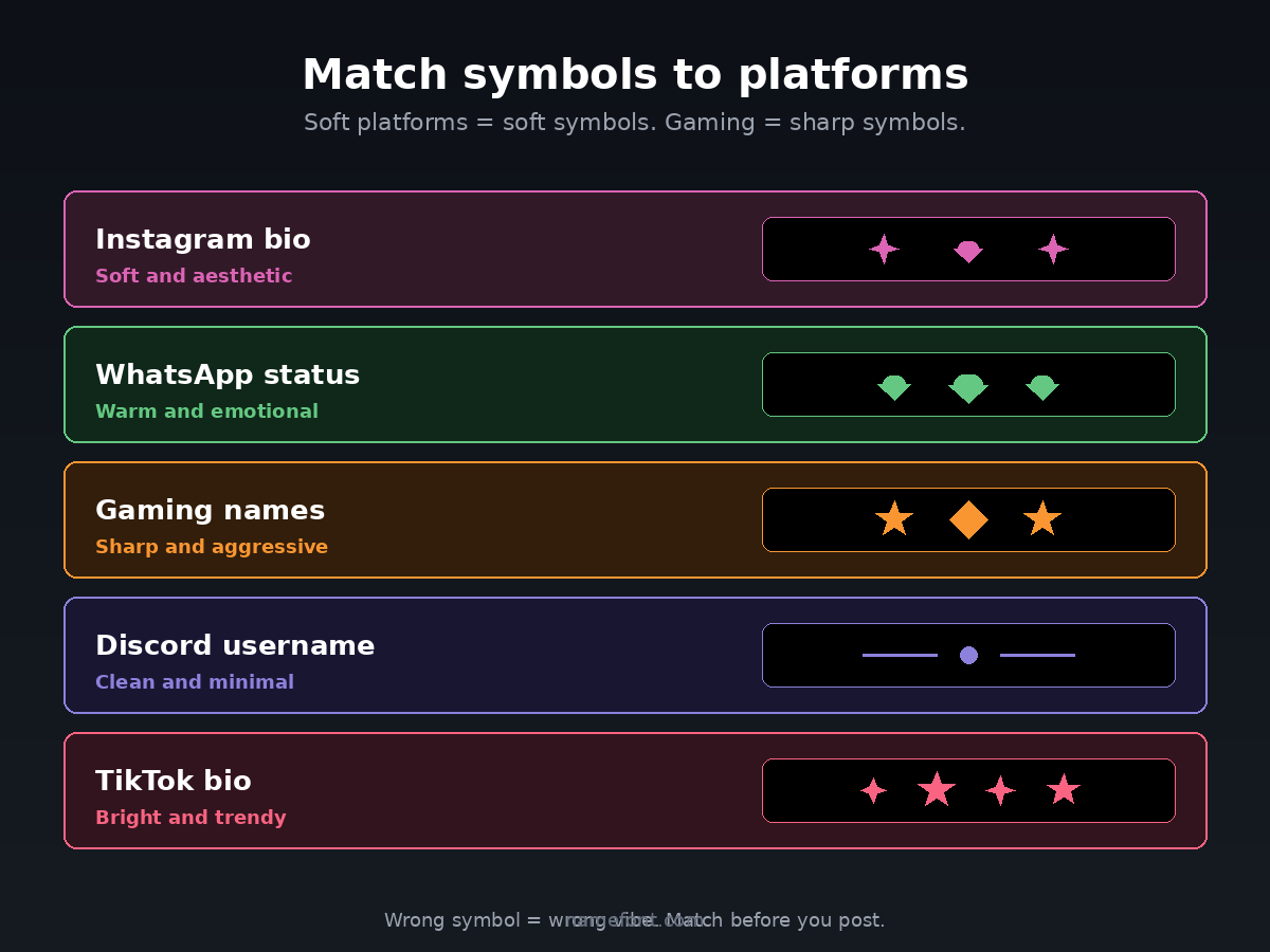 The pattern: match the symbol to the platform's vibe. Soft platforms (Instagram, TikTok) like soft symbols. Aggressive platforms (gaming) like sharp symbols.