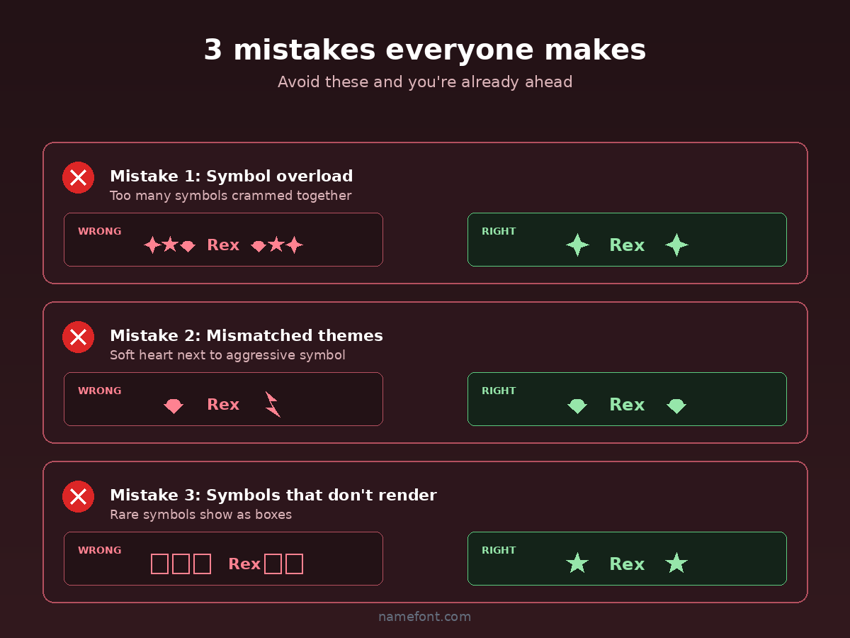 Putting 5 different symbols around one word. ★✦❤Rex❤✦★ looks busy and amateur. Pick ONE symbol, max two, and use them sparingly.