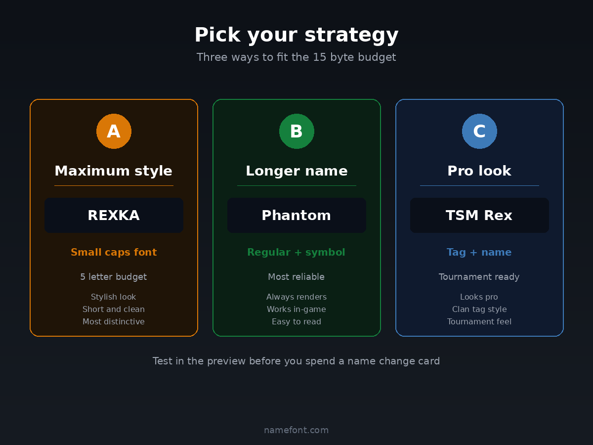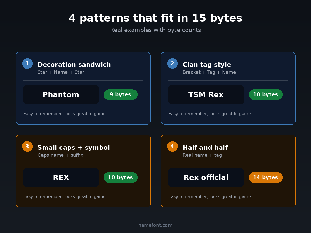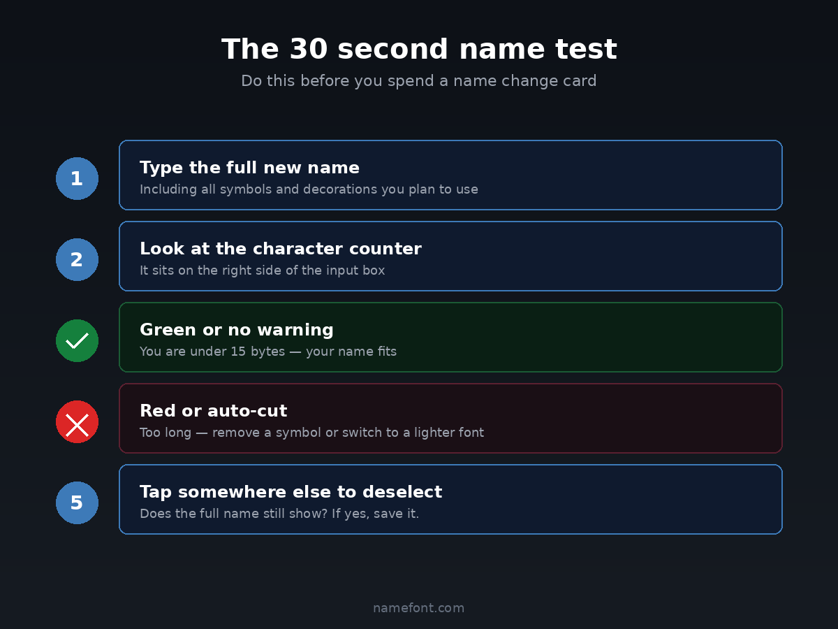 If you want a quick way to see which fonts fit your specific name, the gaming font page shows the byte count for every style. Type your name once, scroll through, pick the version that fits. Saves you from burning name change cards.