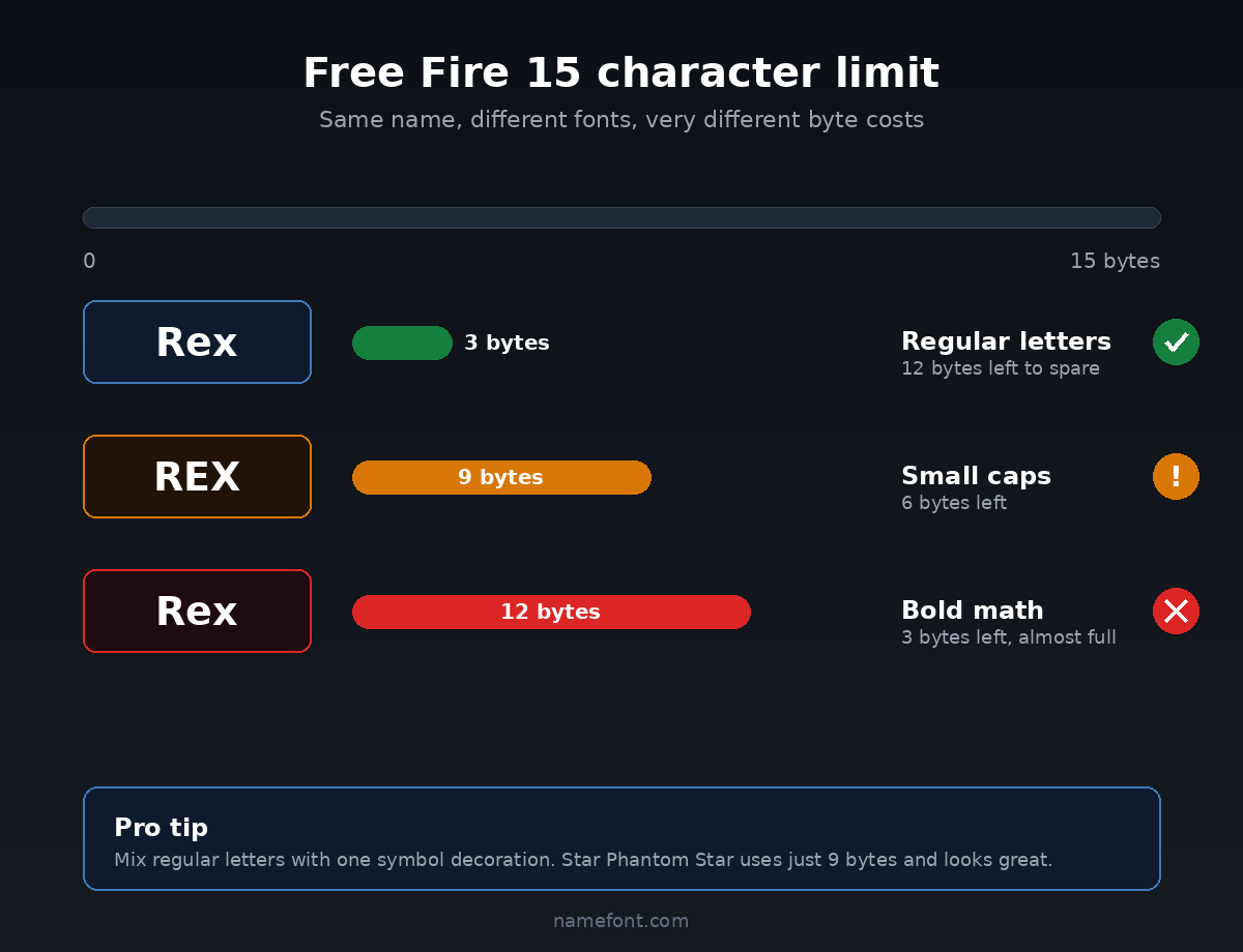 Here's the catch β Free Fire doesn't count letters the way you and I count letters. It counts something called bytes. And every type of font uses a different amount of bytes. So your "Rex" in normal letters is way smaller than "Rex" in fancy letters, even though it looks the same on screen.