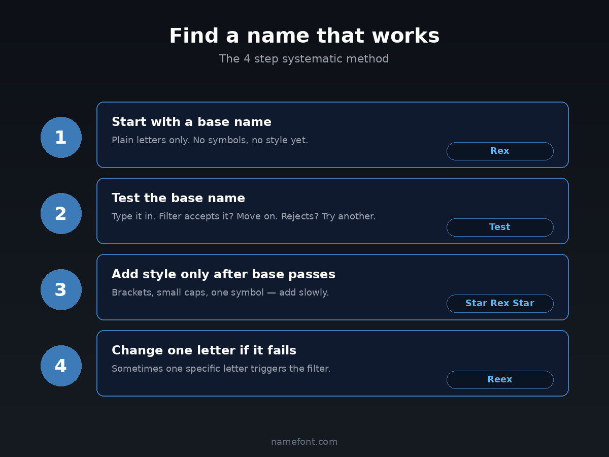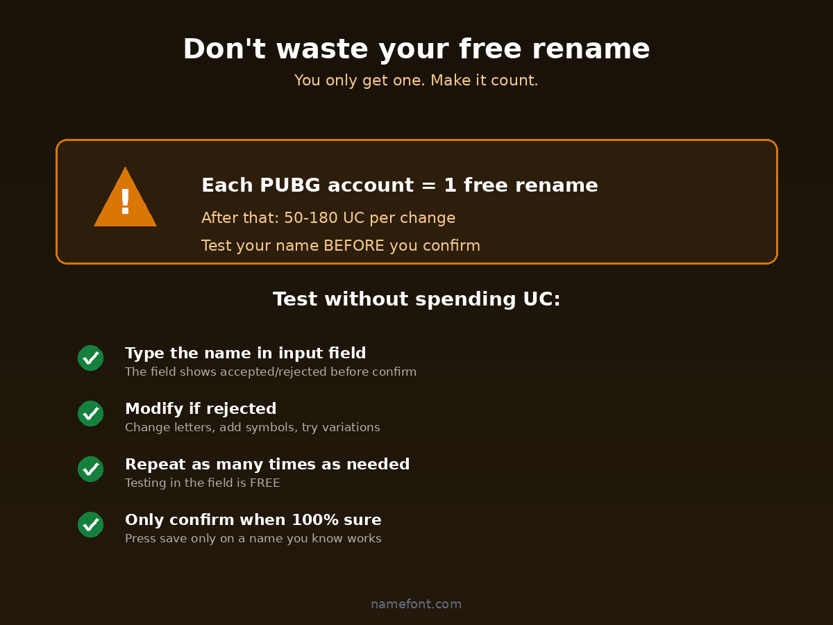 If you want a list of name styles that have been tested and confirmed to work in PUBG Mobile, the gaming font page shows tested-compatible options. Pick one of those styles, plug in your name, and you'll skip 90% of the rejection problems.