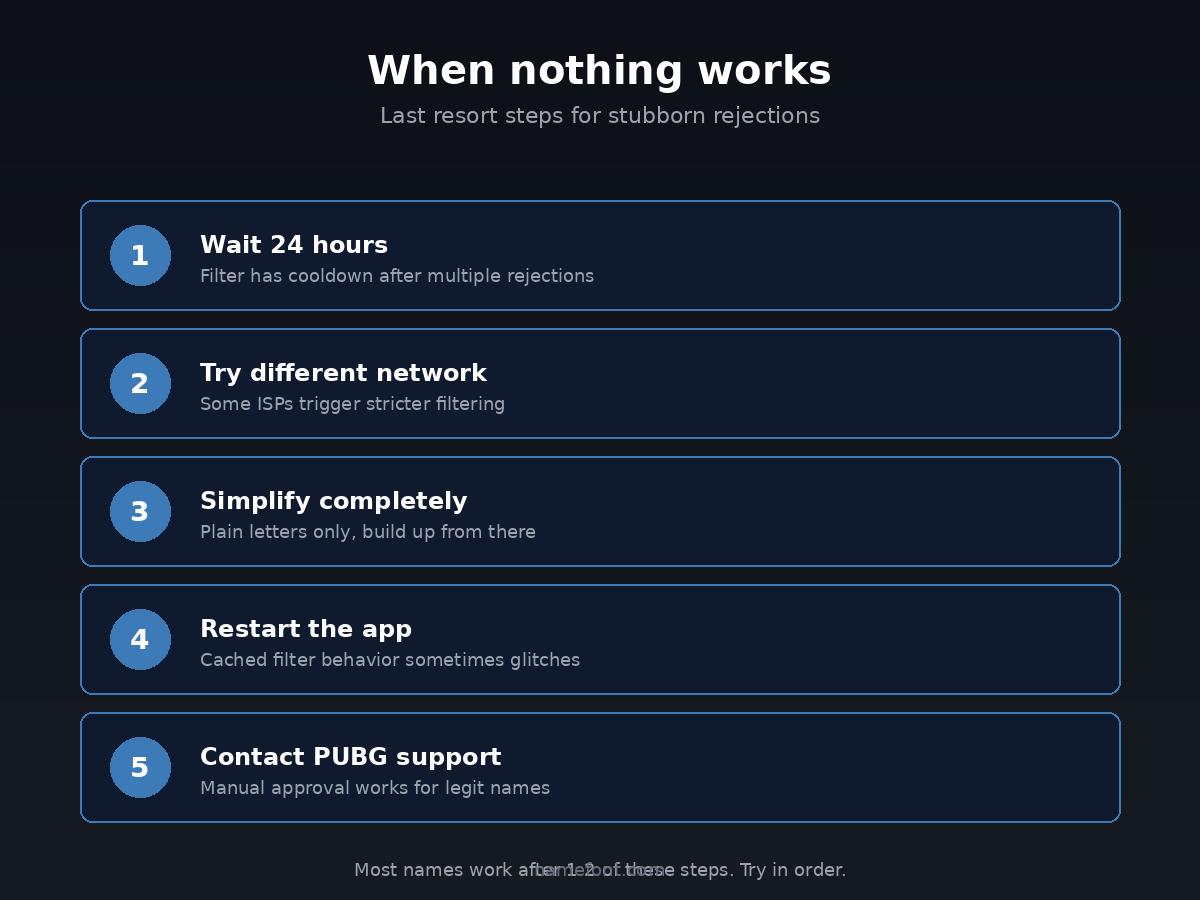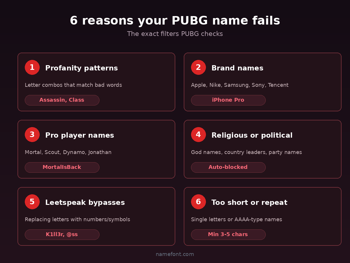 This is the one that catches people the most. PUBG keeps a database of pro player names, popular streamer handles, and esports team tags. All of these are reserved or blocked.