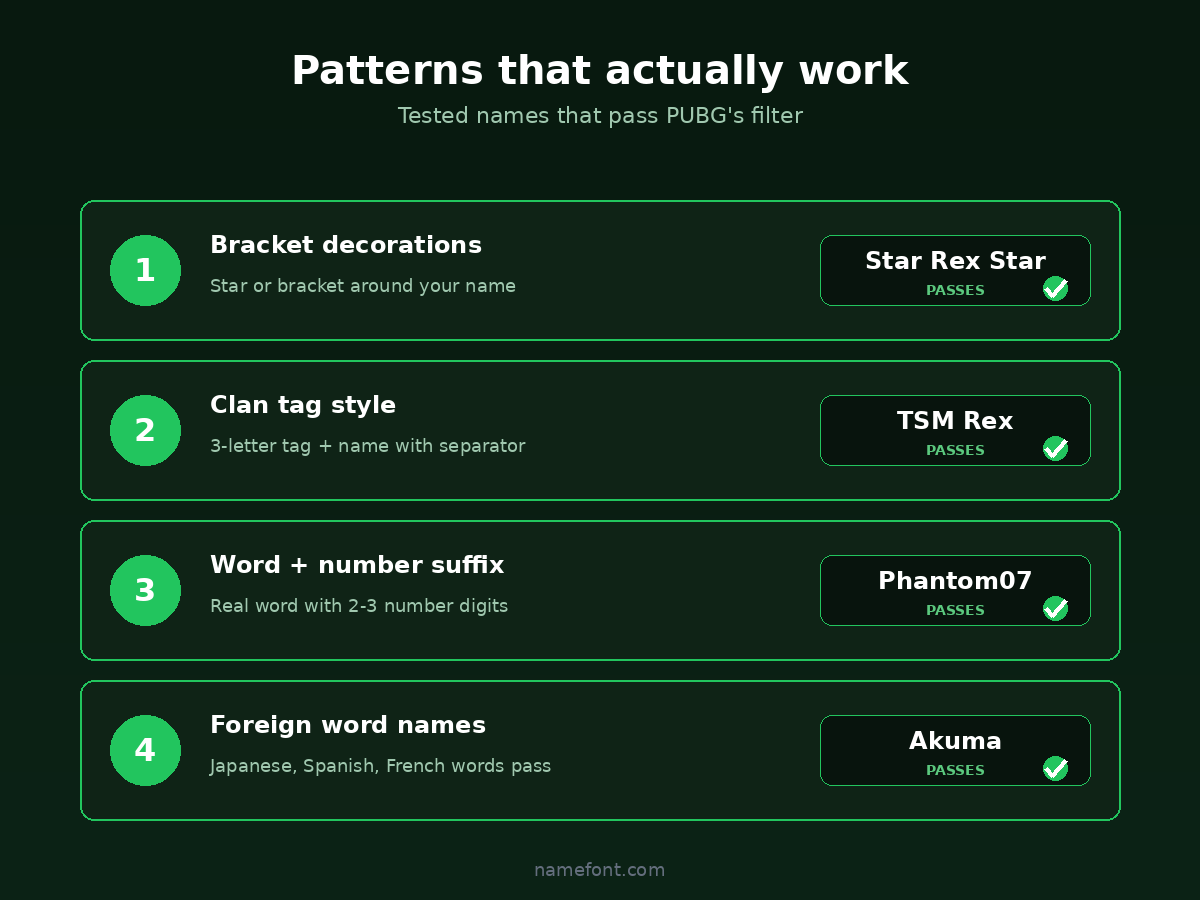 PUBG looks for names that try to bypass filters by replacing letters with numbers or symbols. This is called "leetspeak" detection.