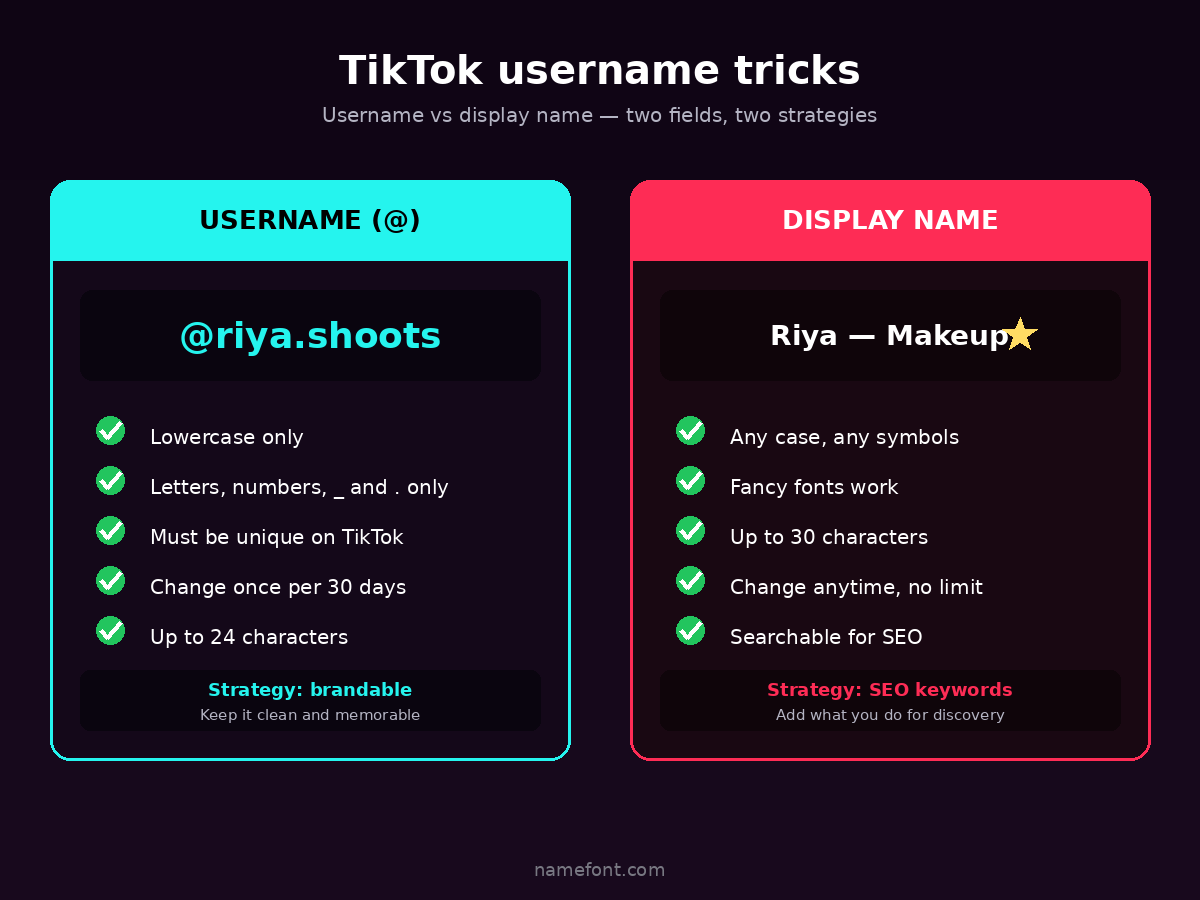 TikTok username game is mostly about three things: keep the @ handle clean and brandable, use the display name for discovery keywords, and don't trip the automated systems with weird symbols.
