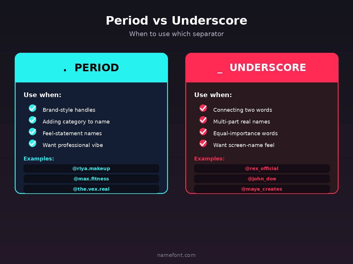 The underscore feels more "screen name." The period feels more "brand handle." Pick based on what you want to project.