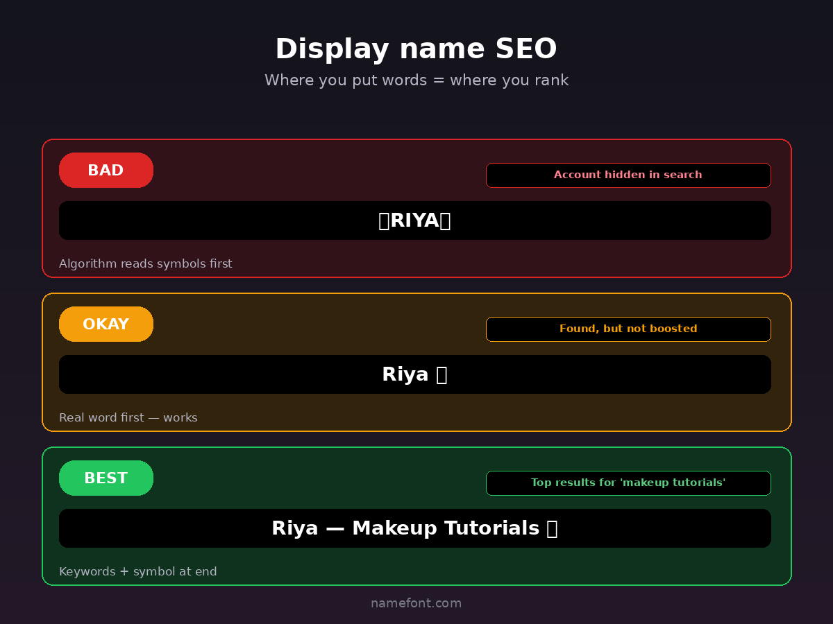 Why this works: when someone searches "bridal makeup" on TikTok, accounts with those words in their display name appear before accounts that only have it in their bio.