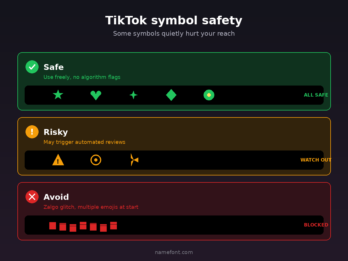 Heads up β certain symbols and characters can trigger TikTok's automated review systems. Not banning, but reduced reach. Here are the safer options: