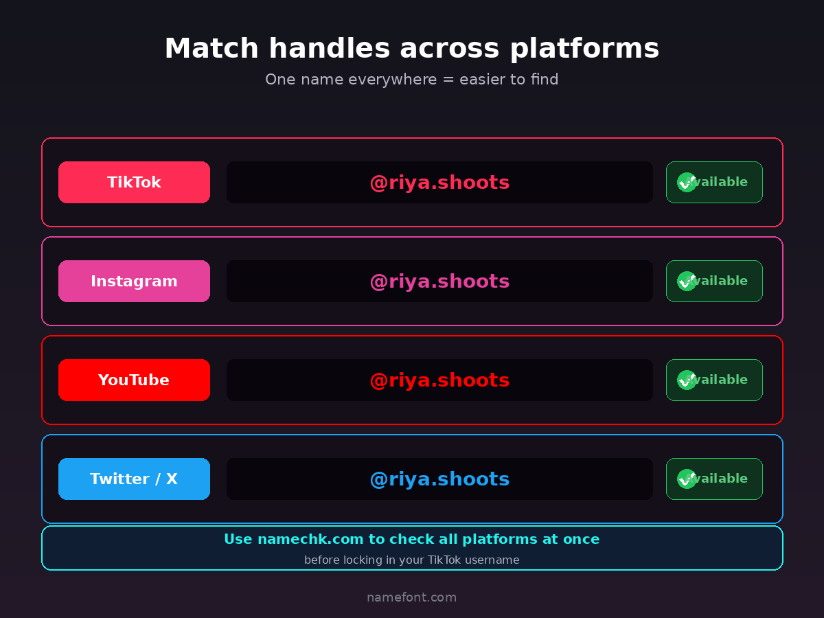 The pros pick handles that work everywhere. That's why creators have names like "@therealmaya" β distinctive enough to be available across all platforms.